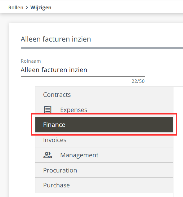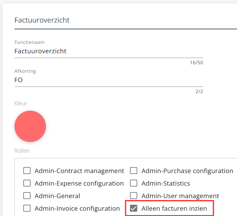 Wil je een gebruiker inzage geven in alle facturen zonder bewerkingsrechten? Maak dan een aangepaste rol aan waarin alleen leesrechten zijn opgenomen. Deze rol kun je koppelen aan een specifieke functie binnen de organisatie. Zodra de rol aan een functie is gekoppeld, wijs je de functie toe aan de betreffende gebruiker.